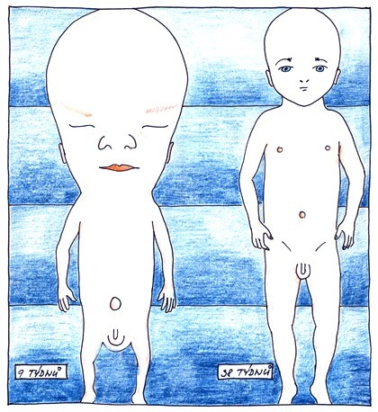 Srovnání tělesných proporcí plodu starého asi 9 týdnů s tělesnými proporcemi novorozeného miminka.